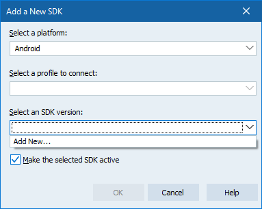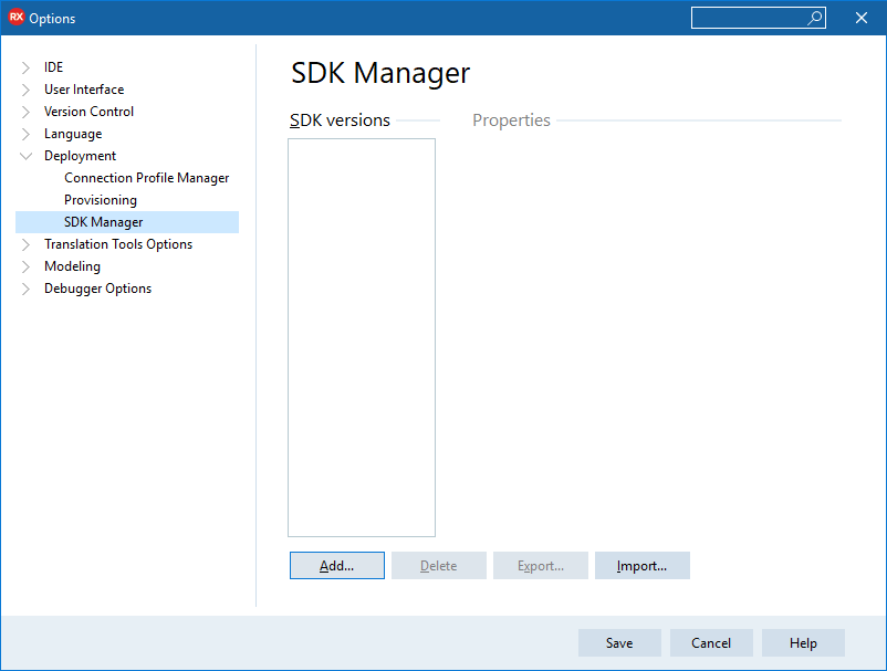 Since we've installed the SDK manually, we need to tell the IDE where to find it. This is really simple. Go into Tools ? Options ? Deployment ? SDK Manager (or just use the IDE search for SDK Manager) and add a new SDK entry.