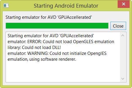 - Copy the OpenGLES libraries - After launching an emulator with Use Host GPU enabled, sometimes you get an error "Could not load OPENGLES emulation library". If you do, then use this tip (if you don't get the error, then skip this tip).